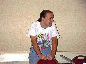 This was me hosting the AWA 98 fanfiction panel, sporting a Tenchi Muyo tshirt and jeans, whlie laughing at the other panelists. Photo by Dillard from WWW.FANSVIEW.COM